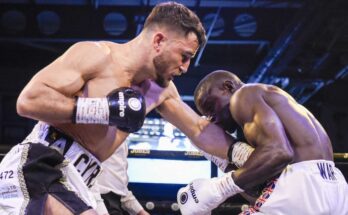 Hall’s debut was over in a blink, knocking out Glen Brown, who was having his second bout, in Woden in Australia’s Capital Territory. He is pictured above having his arm raised by referee Will Soulos.
